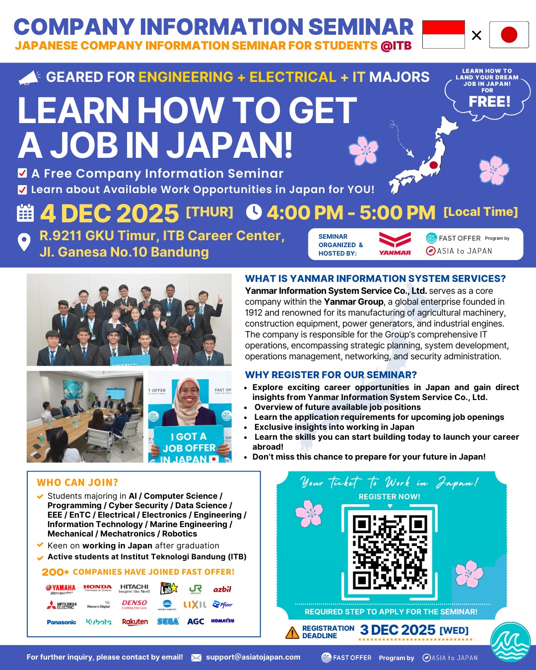 Jangan lewatkan Seminar Yanmar Information System Services x ASIA to JAPAN / FAST OFFER International — sesi informasi gratis untuk mahasiswa IT, Elektro, dan seluruh bidang Engineering!